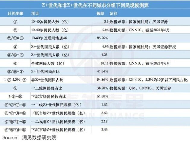 我们假设Z+世代人群(10~35岁)的互联网渗透率,和10~40岁人群类似,根据以下测算方式: