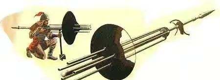 据记载,“5支铳管共重10斤,单管长2尺多”,铳管固定在前后两个圆盘上,呈正五棱形分布,夹角为72°。各铳管均装有准星、照门及供装火药线根火药线彼此间用薄铜片隔开,以保证发射时的安全。铳杆的前部有装銕筒,内装有火球一块,另一端安装一铁制枪头。中部的机匣,上有点火龙头,下有扳机,供5根铳管点火、发射用。前面的盾牌外包生牛皮,里面垫有丝绵、头发和纸等物质,中间开有一圆孔及5个方孔,铳杆从圆孔中通过,铳管从方孔中通过,方孔同时用来观察瞄准,盾牌用来保护射手的安全。