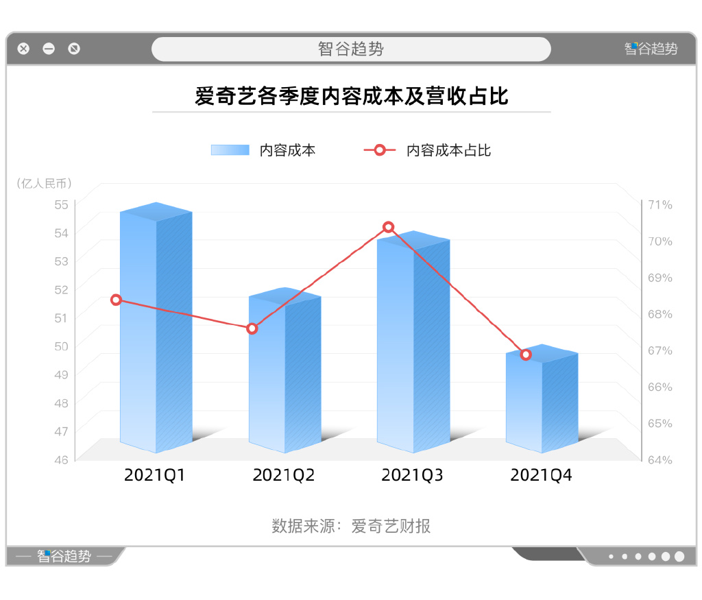 财报数据显示,自2019年一季度以来,爱奇艺内容成本(包括外购版权及自制内容)占营收的比例一直维持在65%以上。