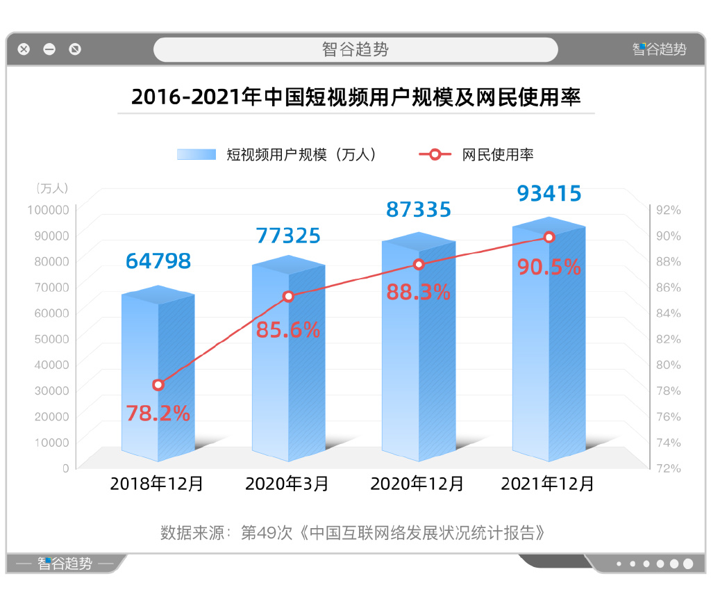 数据上看,短视频已经完成了对长视频的全方位超越——第49次《中国互联网络发展状况统计报告》显示,2021年12月短视频用户规模9.34亿,使用率90.5%,成为名副其实的流量霸主。