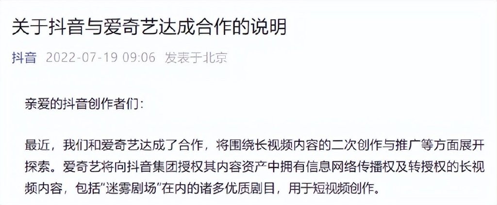 可就在7月19日,抖音集团和爱奇艺宣布达成合作,将围绕长视频内容的二次创作与推广等方面展开探索。