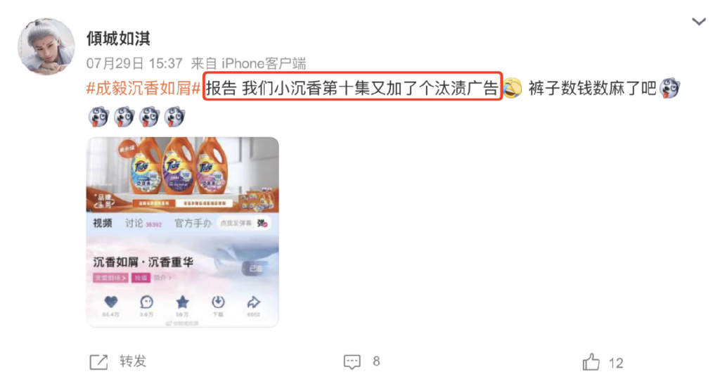 而“统计品牌合作数量”亦是追剧粉丝的每日必“打卡”选项。“报告!我们小沉香第十集又加了个汰渍广告!”、“《沉香如屑》新增了6个广告,厉害了”。在《沉香如屑》的豆瓣小组和微博话题广场中,总能看到粉丝分享《沉香如屑》喜提新合作品牌的激动心情。