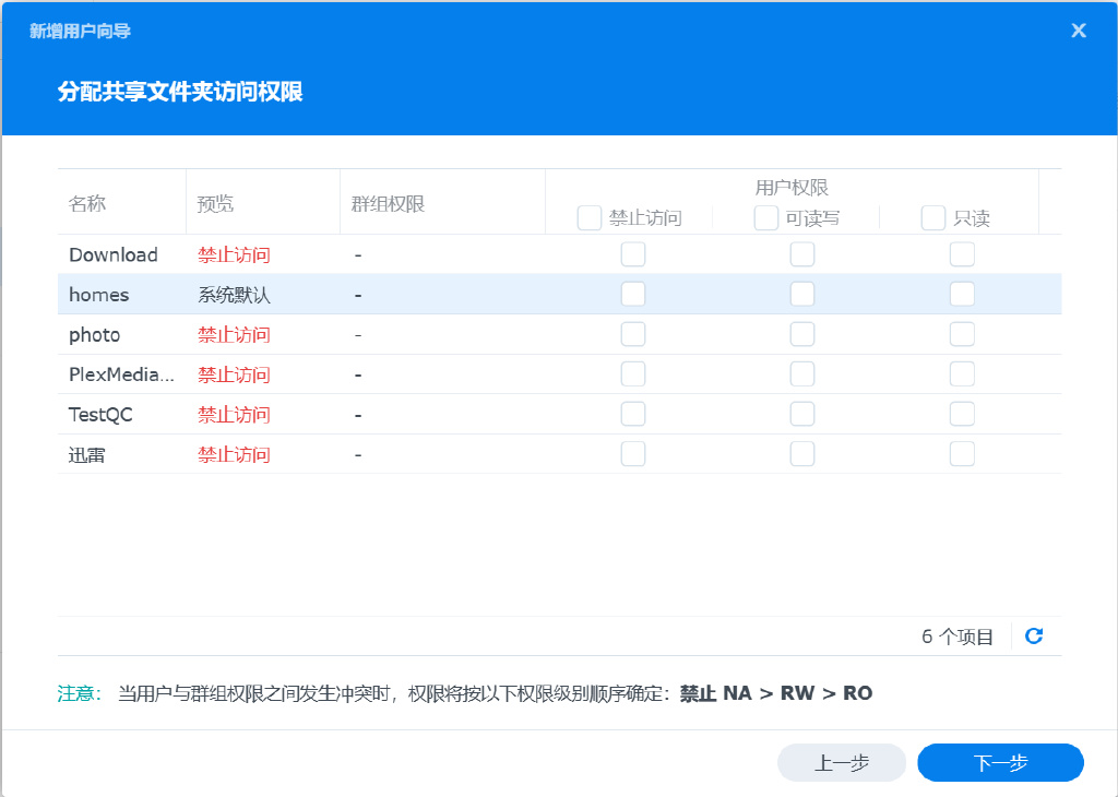 ▼共享文件夹权限按照需求给就行,一般只是用photos默认即可,后面的配额一般也不需要设置。