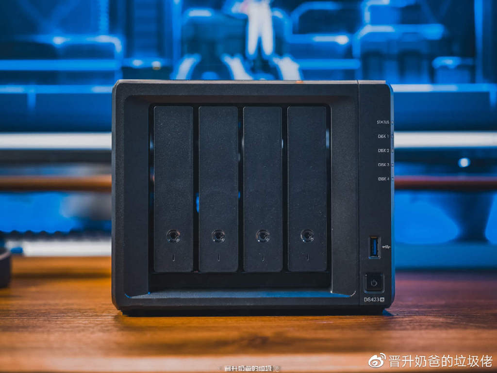 ▼在外观上DS423+与DS920+几乎完全一致,正面分布着4个3.5个硬盘仓、状态指示灯、USB3.2接口以及电源开关按键,若不是右下角的DS423+标识让我出戏,这不妥妥的就是920+。