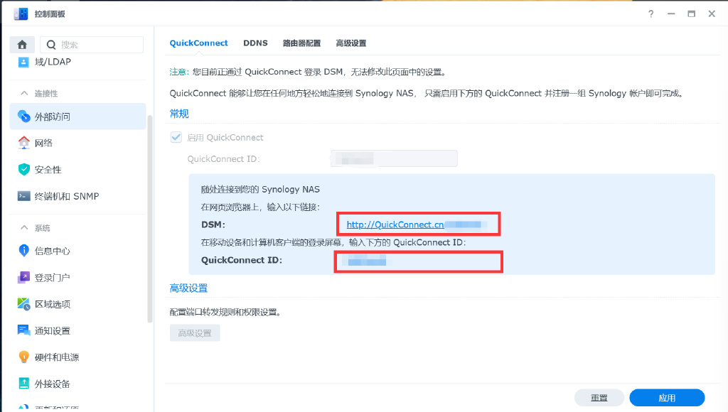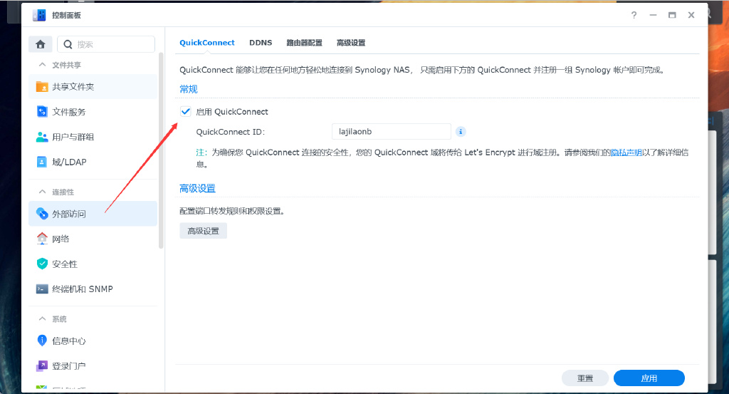 ▼不是每个人都有动态公网IP,也不是每个人都乐于折腾IPV6,或者是Zerotior、DDNS to这些工具,群晖Quick Connect为用户提供了出色的外网访问能力。在控制面板中的外部访问标签开启QC功能,并未自己设置一个短小好记的ID就好。