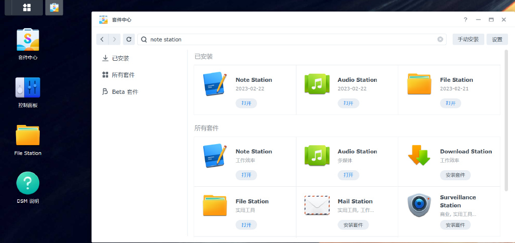 ▼现代人脑袋中的事情太多了,很多东西都需要以笔记的形式记录下来。在线笔记本有很多种,包括印象笔记、有道云笔记、石墨文档等,好用是好用,但是有时候真的很反感自己的笔记上飘着广告,或者是少数使用场景需要付费解锁限制。这时候群晖的Note Station就可以发挥极大的用处。套件中心中搜索note即可下载安装。