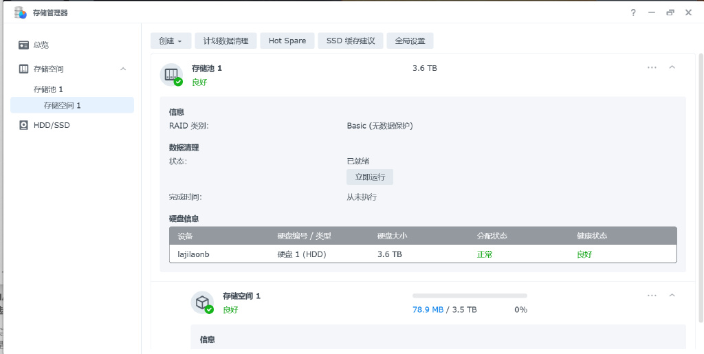 ▼比较骚的是虽然我插了一块M.2固态硬盘,但是这个硬盘不能用于存储,只能用作缓存,我咨询了群晖官方,对方表示,需要用群晖自家的M.2兼容性硬盘,天秀操作。