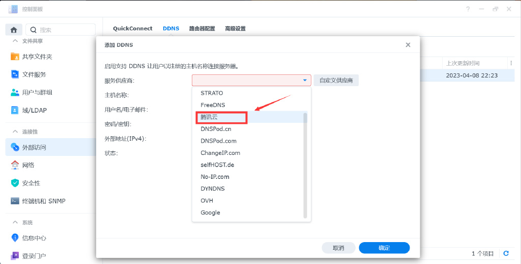 ▼另外群晖自带的DDNS去年的时候新加入了腾讯云作为服务供应商,小伙伴们可以非常方便的在自己的NAS上部署DDNS服务。