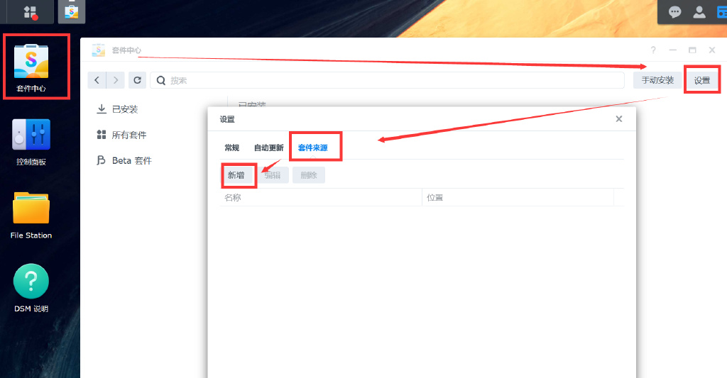 ▼添加第三方套件源只需要进入到套件中心,进入到设置➡套件来源➡新增即可。