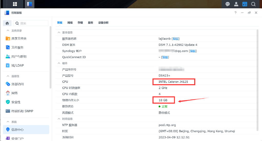 ▼进入到信息中心来瞅一瞅,DS423+ CPU为J4125,插上一条16GB内存之后设备正常显示18GB内存,威联通请把头伸过来过来挨打。J4125还是有一点挑内存的,亲测国产品牌阿斯加特DDR4 2666没问题,国外某光内存也可以,但不论是从漂亮国制裁长存,还是从个人情感上,个人都推荐选用阿斯加特。