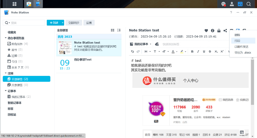 ▼Note Station提供的功能极为丰富,包括笔记标签、加密、分享、演示等,导出为docx格式文件等。