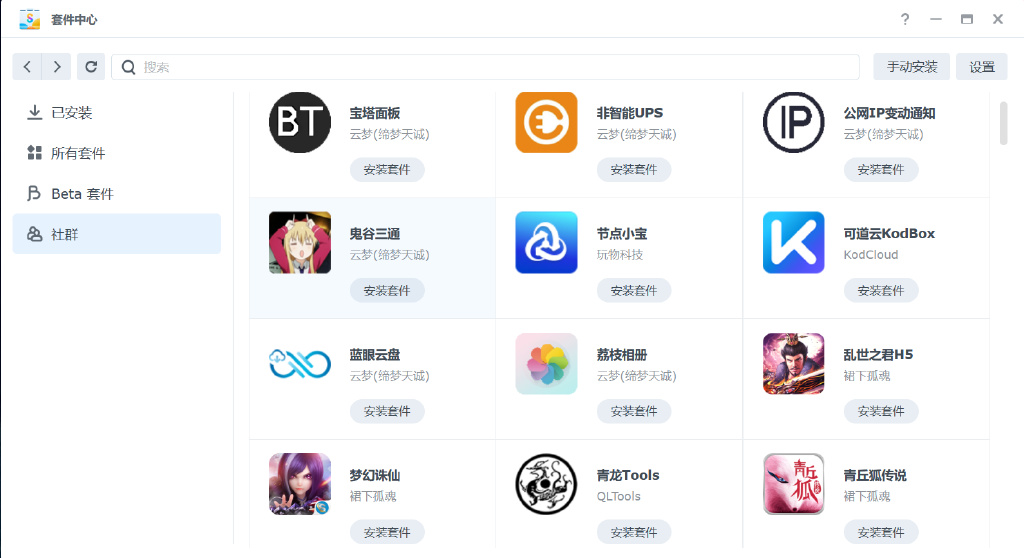 ▼群晖套件中心中本身可以安装的套件不算多,比如说常用的Qbittorrent都木有,第三方套件源为DSM用户提供了更多的可玩性与极大的便利。孤魂甚至还放了几个游戏进去。