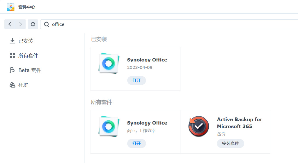 ▼配合Drive,我们十分方便的实现在线文档编辑、轻度办公,在套件中心中搜索office进行部署。