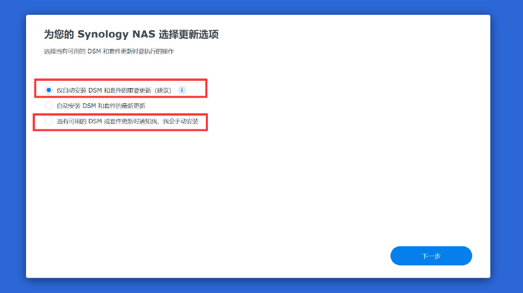 ▼使用黑群晖的用户建议选择手动安装更新,白群晖当然无脑自动更新,毕竟入正不就是为了体验新嘛。