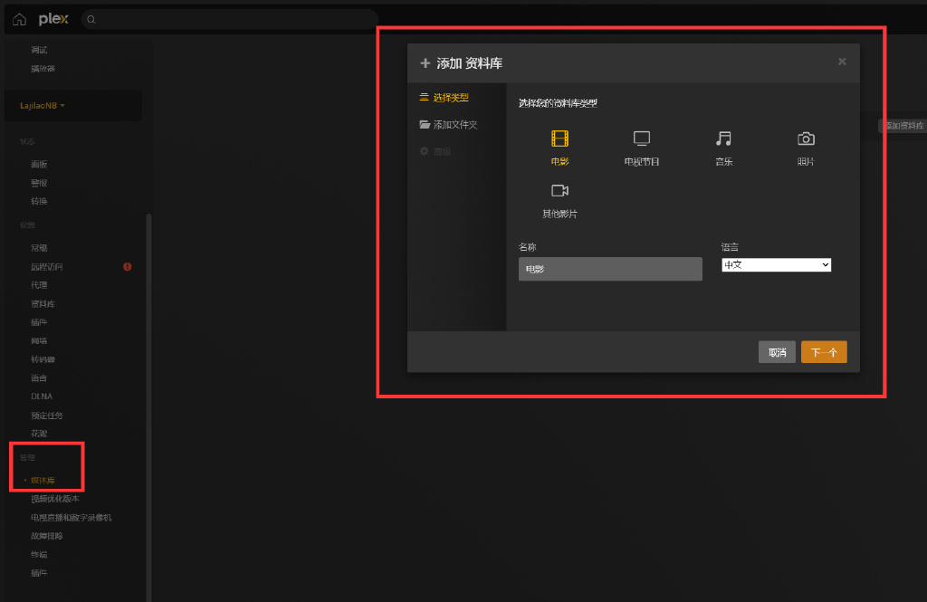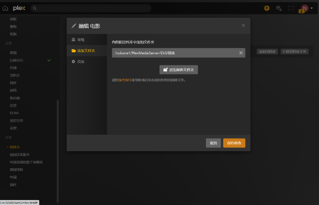 ▼从小扳手进入到管理标签页-媒体库,添加资料库,选择好打算添加媒体资源的文件夹。