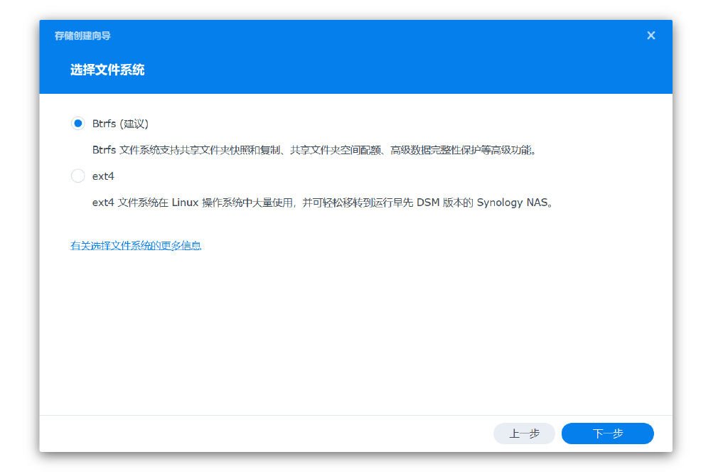 ▼关于文件系统是选择Btrfs还是ext4,在广大玩家中是有一定的争议的,多数情况下我也是更倾向于ext4,但是!但是如果使用ext4就无法在群晖NAS上部署虚拟机,还有一些其他小的影响,因此建议还是采用群晖的建议,选用Btrfs。