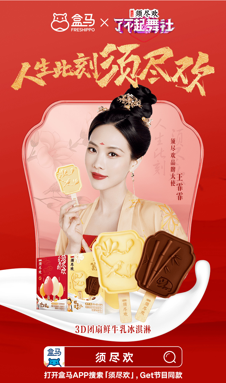 包括与盒马、大润发、天猫校园等更多阿里生态核心资源的联动,进行线下营销升级,不但提升了IP营销的效率,也同时实现了品牌客户利益的拓展和加深。去年《了不起!舞社》的冠名商伊利须尽欢,借助节目IP势能撬动盒马优质资源,并通过盒马域内大嘴尝鲜等特色营销IP联名玩法,联名冰淇淋多次成为各地盒马冰激凌爆品。