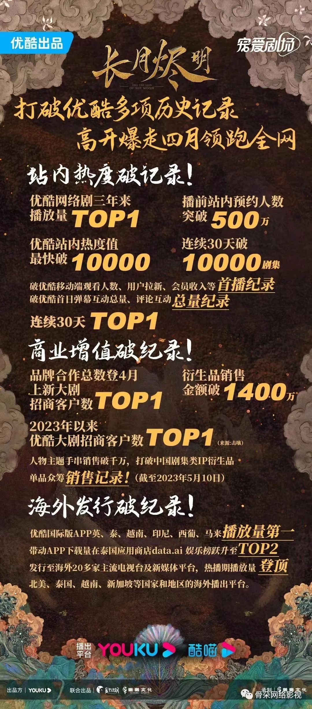 此外,《长月》的“爆”也体现在商业增值方面,该剧的品牌合作总数为4月上新大剧招商客户数TOP1,也是2023年以来优酷大剧招商客户数TOP1。该剧衍生品销售金额破1400万元,人物主题手串销售破千万,打破了中国剧集类IP衍生品单品众筹销售额纪录。